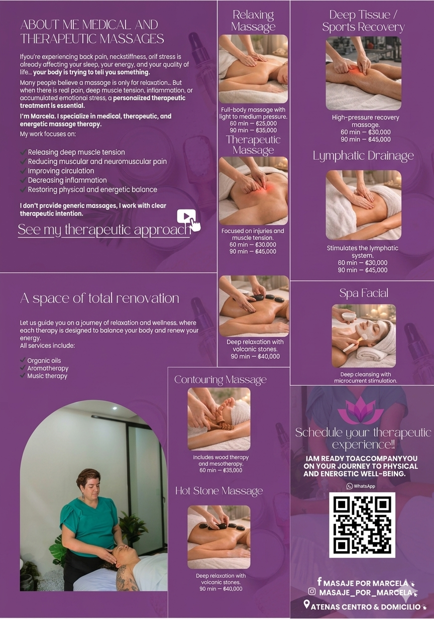 Marcela is known for her punctuality, professionalism, and high-quality therapeutic care, making her a trusted provider for individual clients and wellness programs in Atenas.